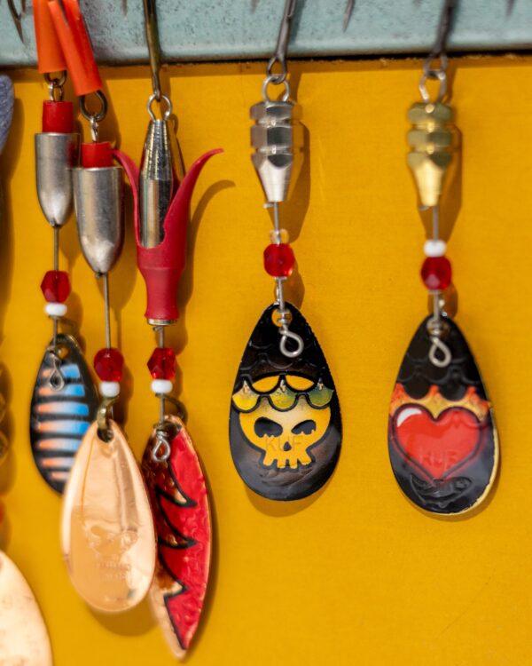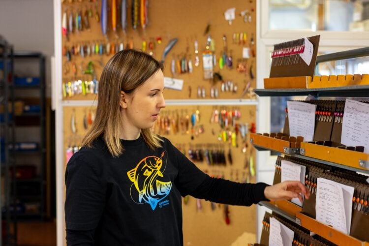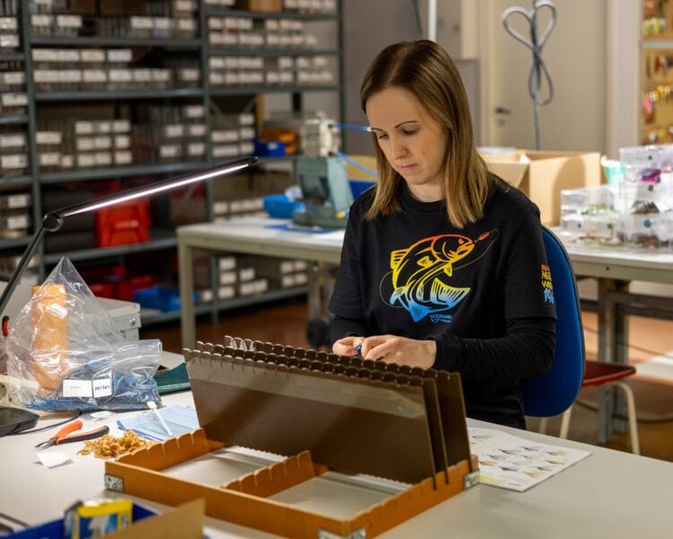 Eri pisteissä työtä tehdään tarkasti muun muassa asettamalla syöteille silmiä ja hameita, ja isossa uittoaltaassa testataan ja säädetään mm. vaappujen uintikykyä. Vuosiuistimien myyntirasiatkin tehdään käsin kultaisia koristetekstejä myöten, jotka sitten pakataan ja lähetetään maailmalle.